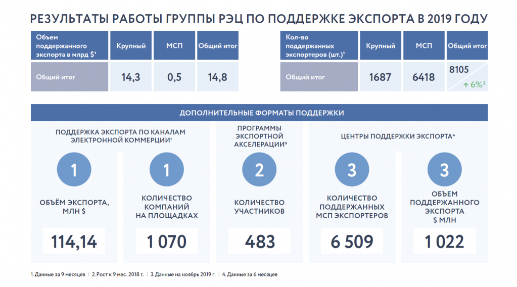 Андрей Слепнев отметил, что в прошлом году благодаря механизмам страхования, финансирования и продвижения РЭЦ поддержал российский экспорт на общую сумму 18 млрд долларов. За первые три квартала 2019 года поддержку от РЭЦ получили более 8 тыс. экспортеров (на общую сумму 14,8 млрд долларов).