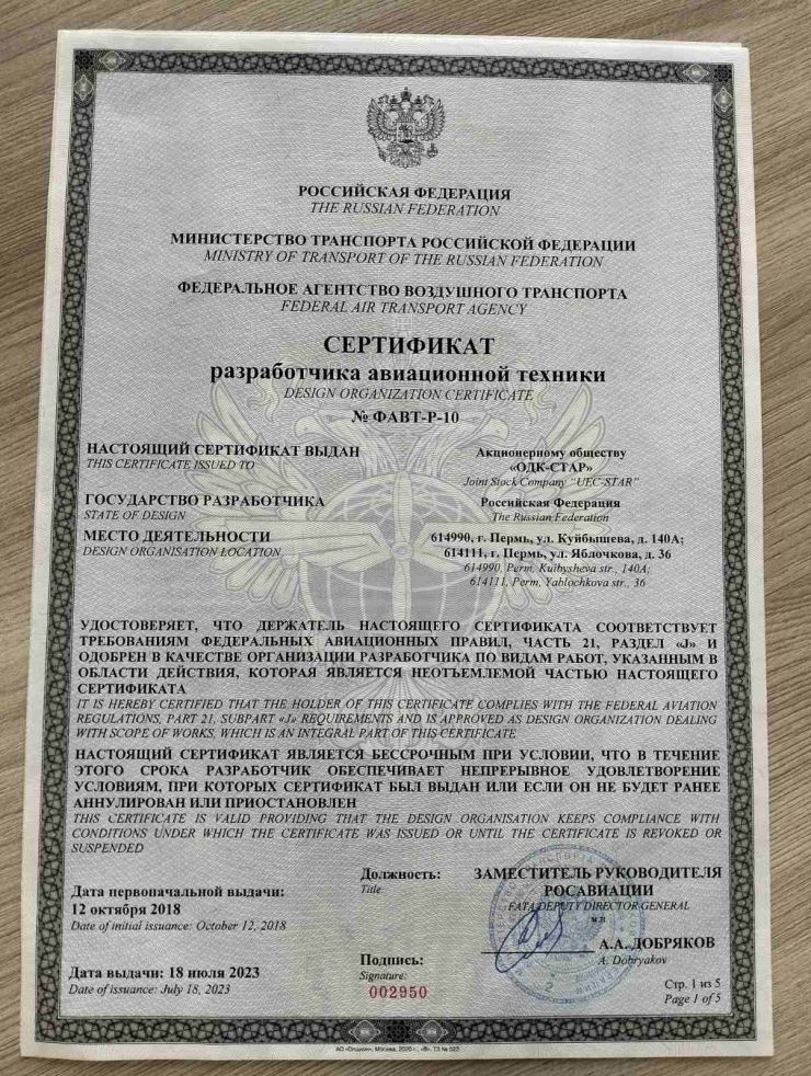 UEC-STAR extended the certificate of the developer of aviation equipment
