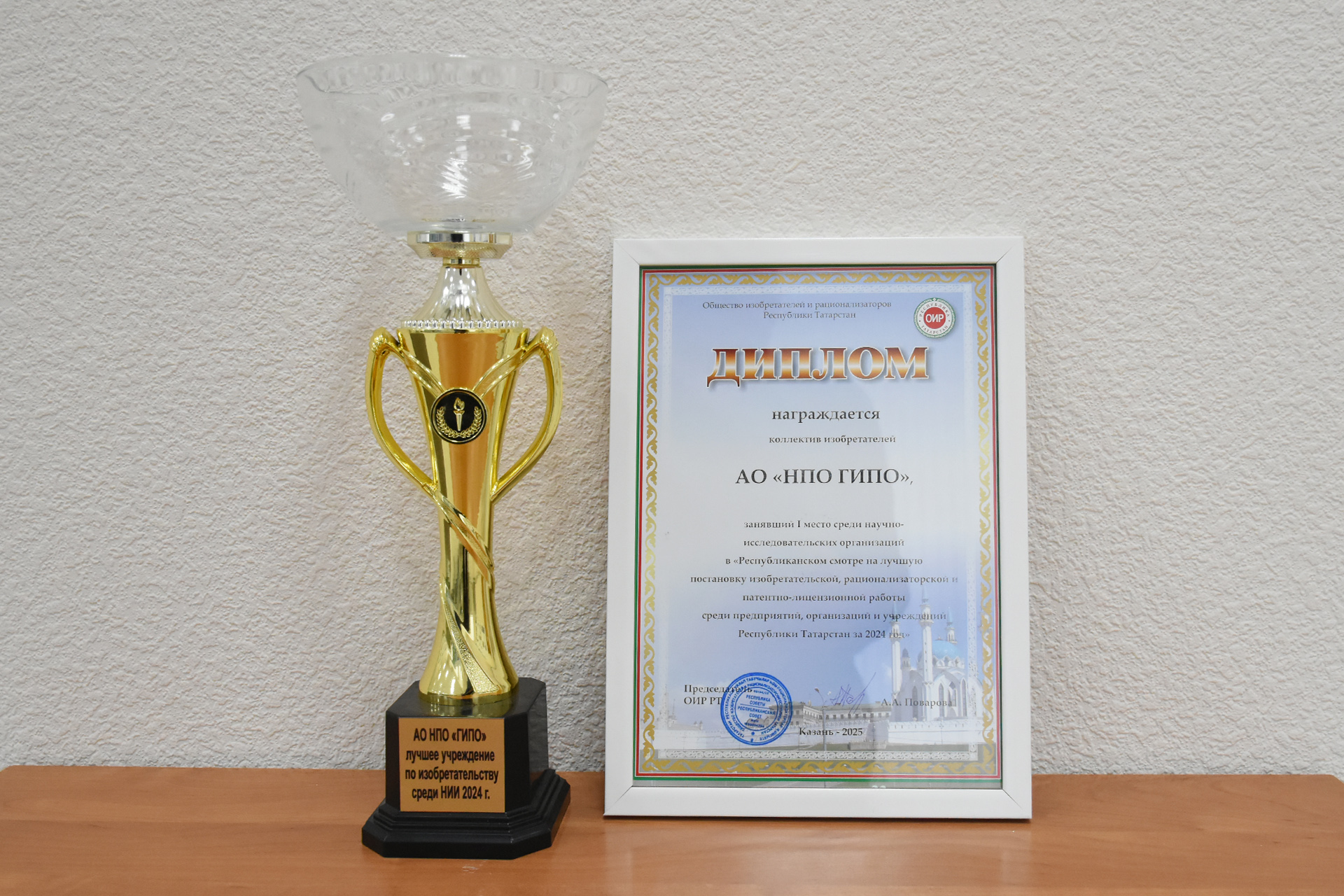 НПО ГИПО был удостоен высшей награды Республики Татарстан в сфере инноваций – диплома и кубка с присвоением звания «Лучшее учреждение по изобретательству среди научно-исследовательских институтов 2024 года». Жюри республиканского смотра отметило выдающиеся результаты работы предприятия по созданию перспективных оптических покрытий, дифракционной и асферической оптики.