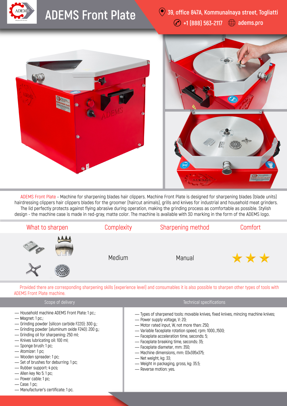 The ADEMS Front Plate Inverter machine is designed for professional sharpening of hair clippers blade for barbers and groomers, meat grinder plate and knives.