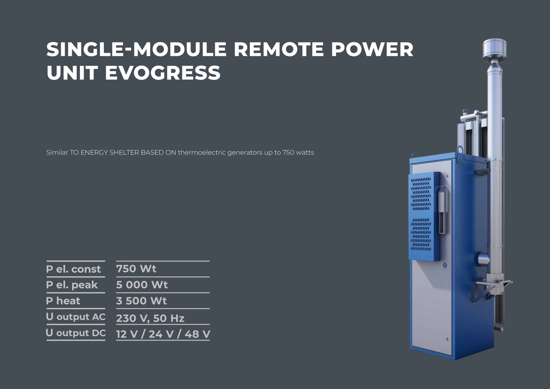 Источник автономного энергообеспечения ЭВОГРЕСС во всепогодном антивандальном исполнении для основного электро- и теплоснабжения объектов с постоянным электропотреблением от 1 до 10 кВт (кратковременная перегрузочная способность от 3-х до 30 кВт). В штатной комплектации реализована возможность подключения и работы ВИЭ в приоритетном режиме, а также предусмотрена инверторно-накопительная система для гарантированного обеспечения кратковременного пикового энергоснабжения