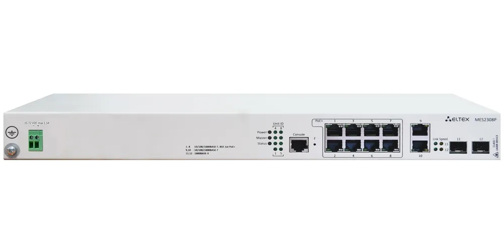 MES2308P DC - управляемый стекируемый коммутатор уровня L2+ с 10 портами 10/100/1000BASE-T (RJ-45). 8 портов PoE/PoE+ и 2 порта 1000BASE-X (SFP). Ethernet-коммутатор подключает конечных пользователей к сети крупных предприятий, предприятий малого и среднего бизнеса и к сетям операторов связи с помощью интерфейсов Gigabit Ethernet.
