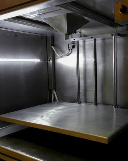 Машина имеет ручную систему управления чашами для компонентов с помощью рычагов. Сам корпус изготовлен из прочной стали и покрыт порошковой краской.