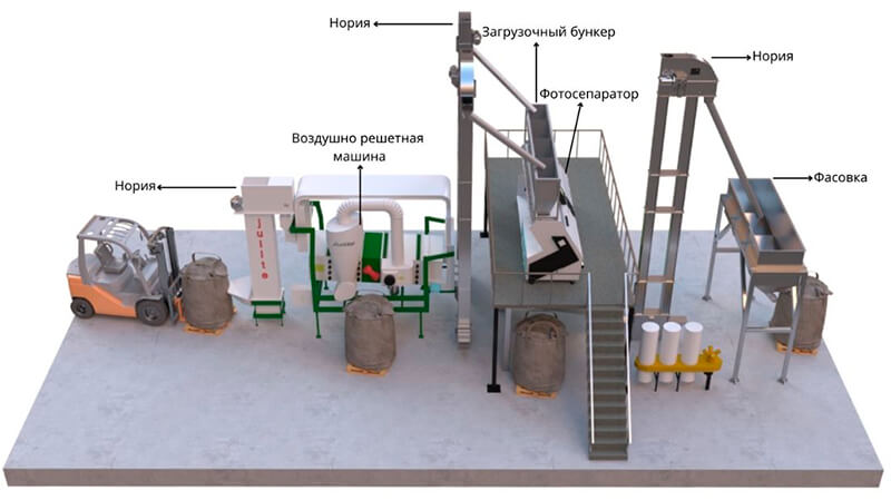 Cleaning line for cereals, legumes and oilseeds